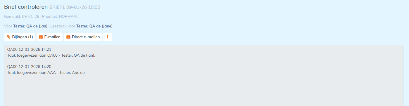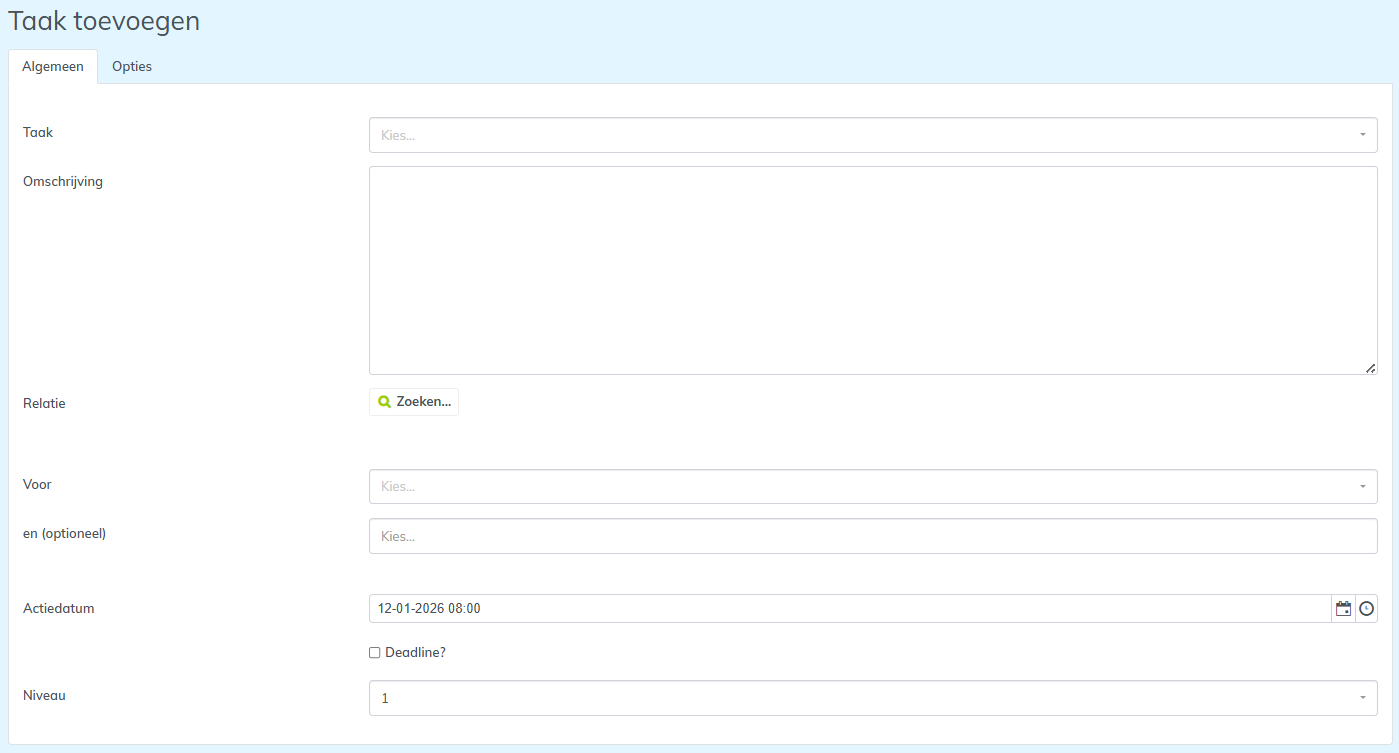 Bij het aanmaken van een taak is het veld Voor verplicht. Dit is de medewerker aan wie de taak wordt toegewezen. Daarnaast is het mogelijk om bij een taak het veld Optioneel te vullen. Dit is de medewerker die de taak als leestaak krijgt toegewezen.