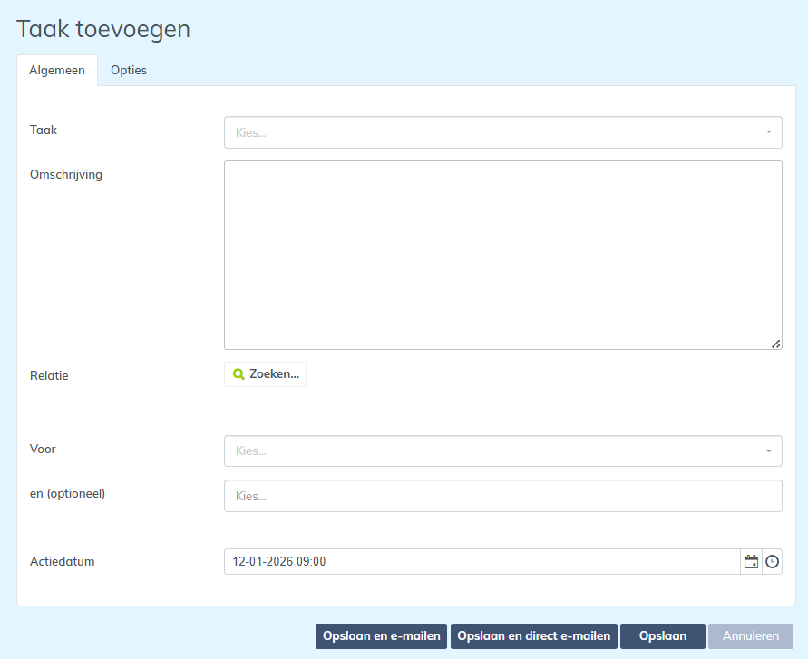 Na het invullen van de taakgegevens of bij het bekijken van een bestaande taak kun je kiezen voor: