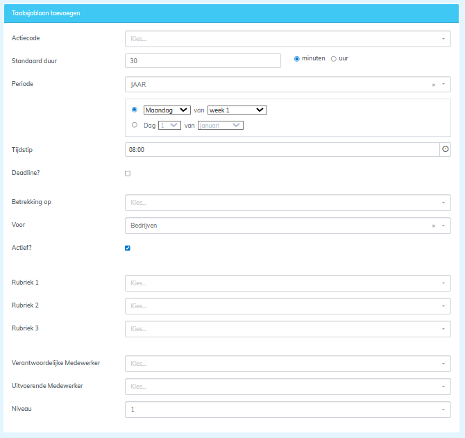 Indien je bij de rubrieken hebt ingesteld dat een rubriek is gekoppeld aan een boekjaar, dan kan de rubriek in het taaksjabloon worden leeg gelaten. Bij het aanmaken van de taken wordt hier dan automatisch het betreffende boekjaar ingevuld. - Optioneel kun je de verantwoordelijke medewerker invullen.