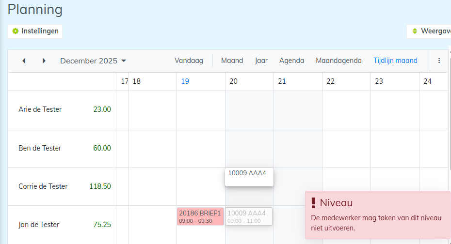 Bij het herplannen wordt niet alleen naar de deadline van een taak gekeken, maar ook naar het niveau van een medewerker. Als het niveau van de medewerker voor die taak lager is dan het ingestelde niveau, dan kan de taak niet herpland worden naar de medewerker.