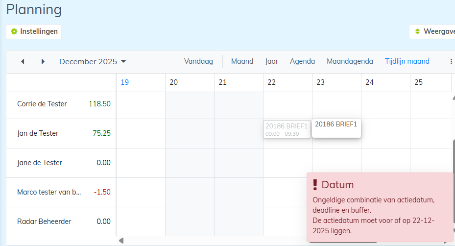 Bij het herplannen wordt niet alleen naar het niveau van een taak en een medewerker gekeken, maar ook naar de deadline van de taak. Als de nieuwe actiedatum van een taak niet op of voor de deadline (- buffer) ligt, dan wordt een melding getoond.